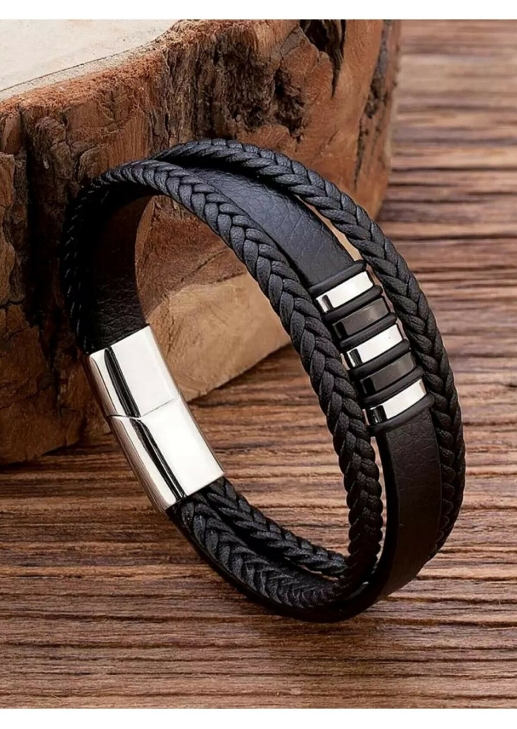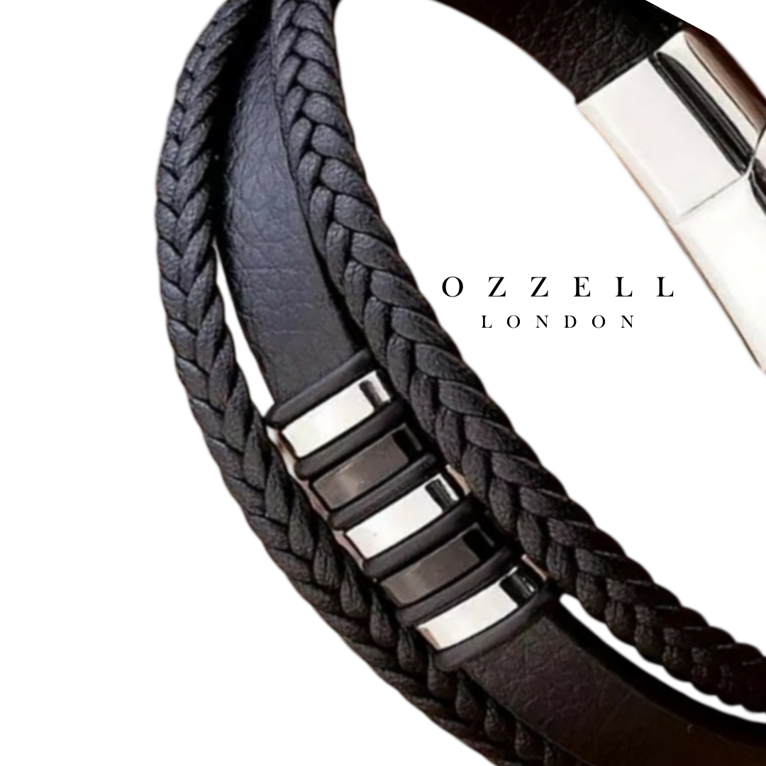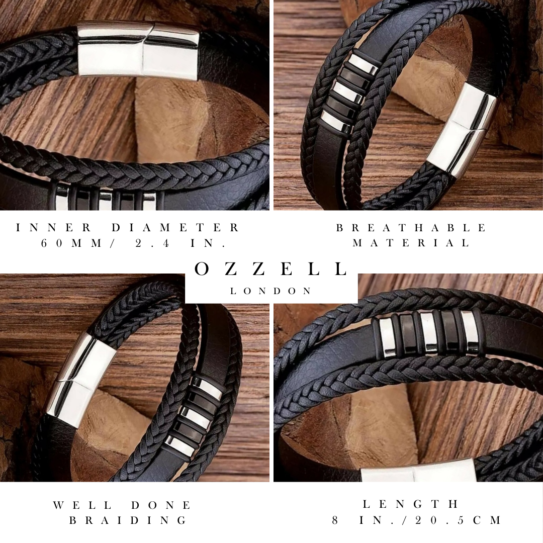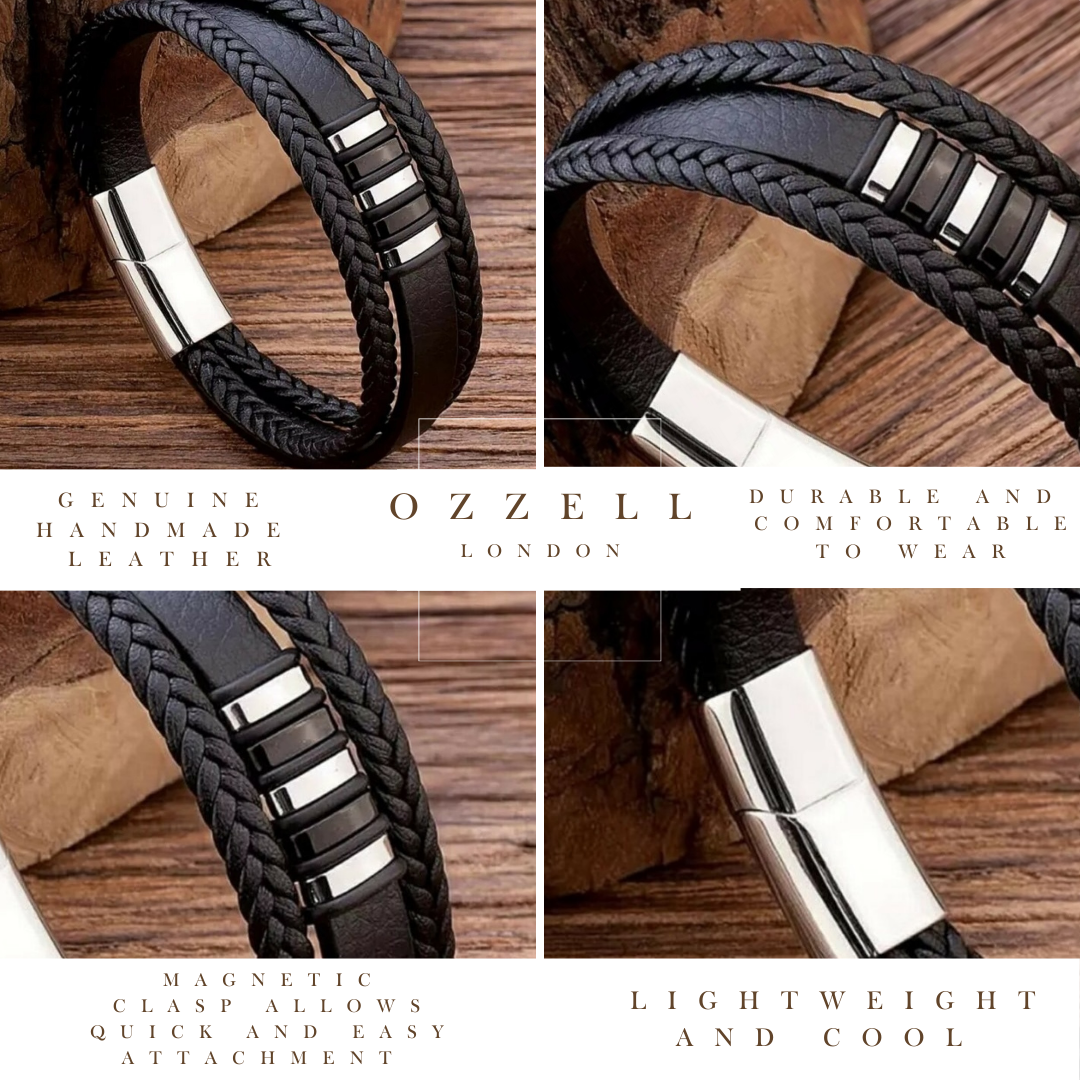 Introducing our Black Genuine Leather Braided Bracelet with a metallic accent, a timeless accessory that seamlessly blends rugged charm with understated elegance. Crafted from premium leather, this classic braided design exudes sophistication and versatility. The rich black hue, enhanced by the metallic accent, adds a refined touch to any outfit, while the supple leather ensures durability and comfort. Perfect for both casual and formal attire, this bracelet elevates any ensemble. Each piece comes beautifully packaged in a black velvet pouch, along with an Ozzell London thank you card, making it an ideal gift for yourself or someone special. This accessory is ideal for Valentines Day gifts, Anniversary gifts, Birthday gifts, Father's day gifts, etc. These bracelet make a super gift for your boyfriend or girlfriend.